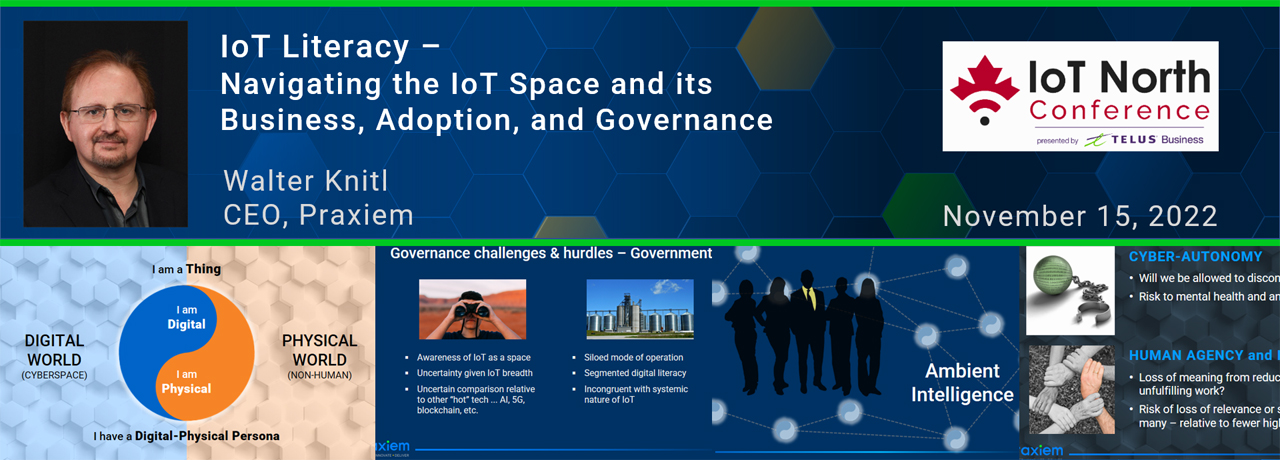 Praxiem is active in the Canadian IoT community. That includes speaking about IoT, powering IoT North and its events and podcasts, and contributing to AIoT Canada on its board of directors. We believe IoT is poised to underpin growth in the Canadian economy, but it also requires appropriate governance to amplify benefits and mitigate any ill effects. And to that, we lend our support through praxiemTALKS.